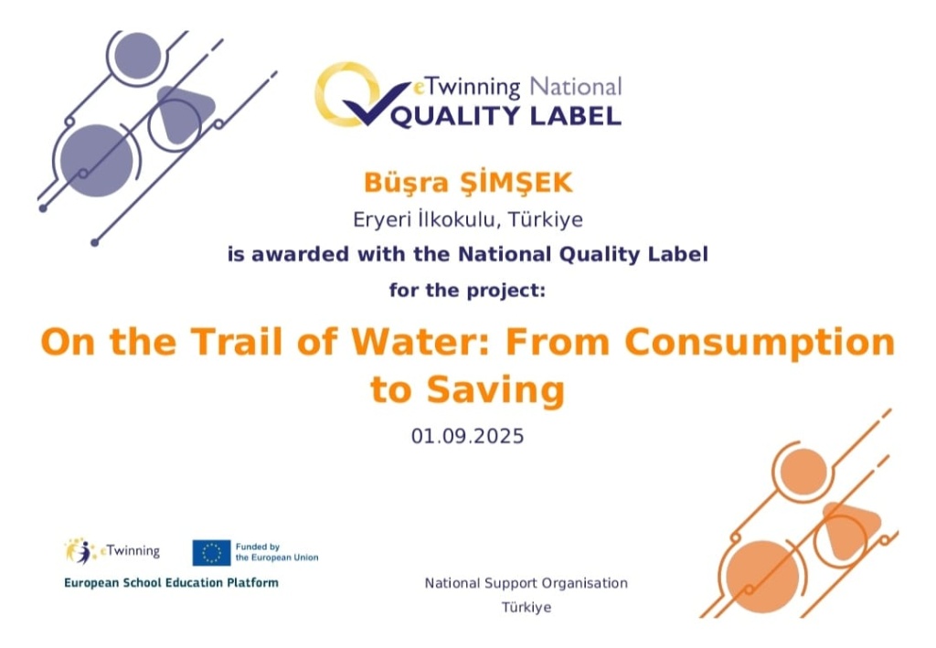 Okulumuz öğretmenlerinden Büşra ŞİMŞEK, yürüttüğü “Tüketimden Tasarrufa: Suyun İzinde” adlı eTwinning projesiyle eTwinning Kalite Etiketi Ödülü almaya hak kazanmıştır.
